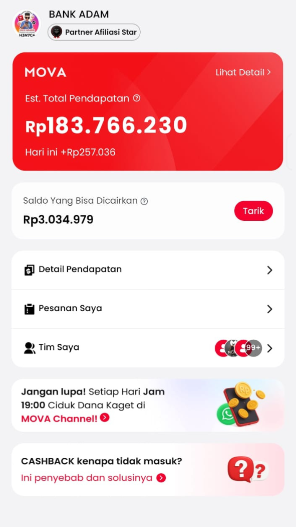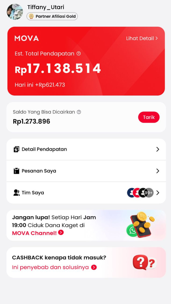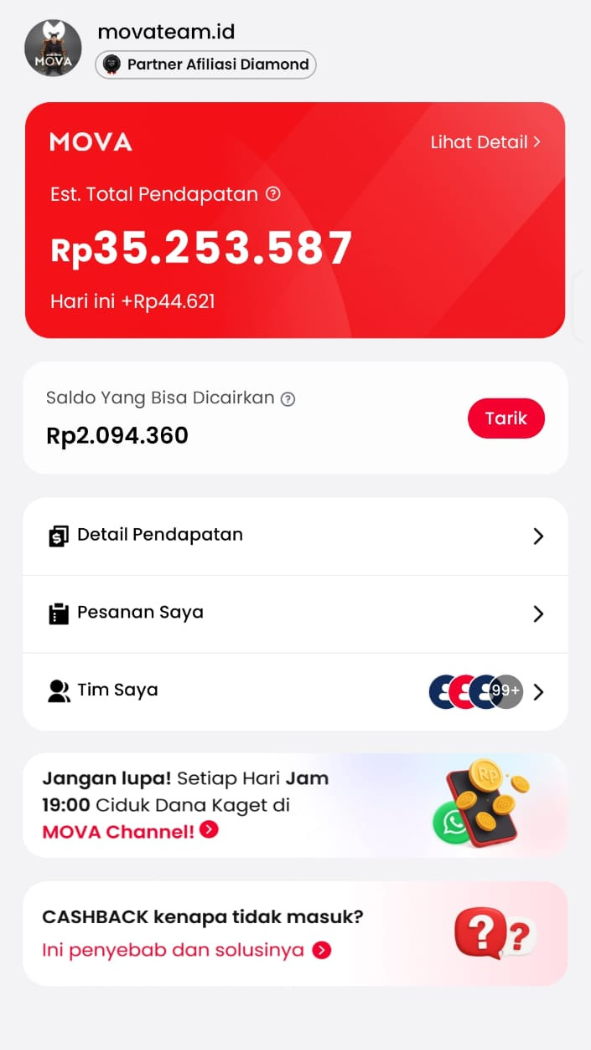 Cashback instan tiap belanja di Shopee, Tiktok, Lazada, Tiket.com, & Traveloka. Gabung MOVA Team, raih komisi berkelanjutan seumur hidup!